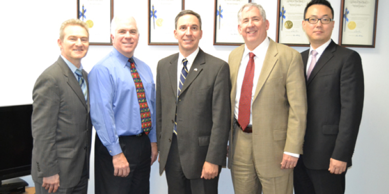 Senator Jack M. Martins recently met with insurance brokers from the Chester Agency in Carle Place to discuss issues important to them. Pictured with Senator Martins are Stephen Folan, Andrew Chong, Evan Portnoy and Bruce Chester.