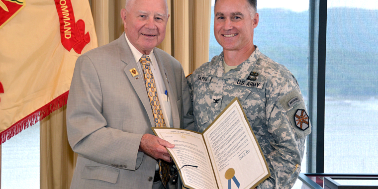 Senator Bill Larkin presents Colonel Mike Tarsa with a Legislative Resolution honoring him for his work as United States Army Garrison Commander at West Point.