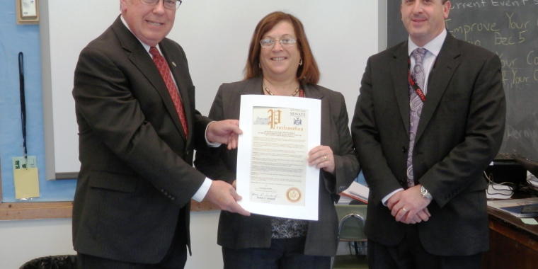 Stallman presented Senator Seward with a special resolution written and adopted by students from Herkimer and Utica school districts at the recent Mohawk Valley Student Summit 2015.