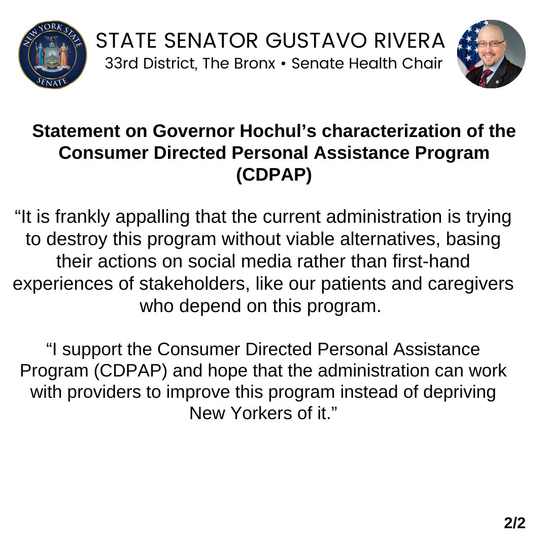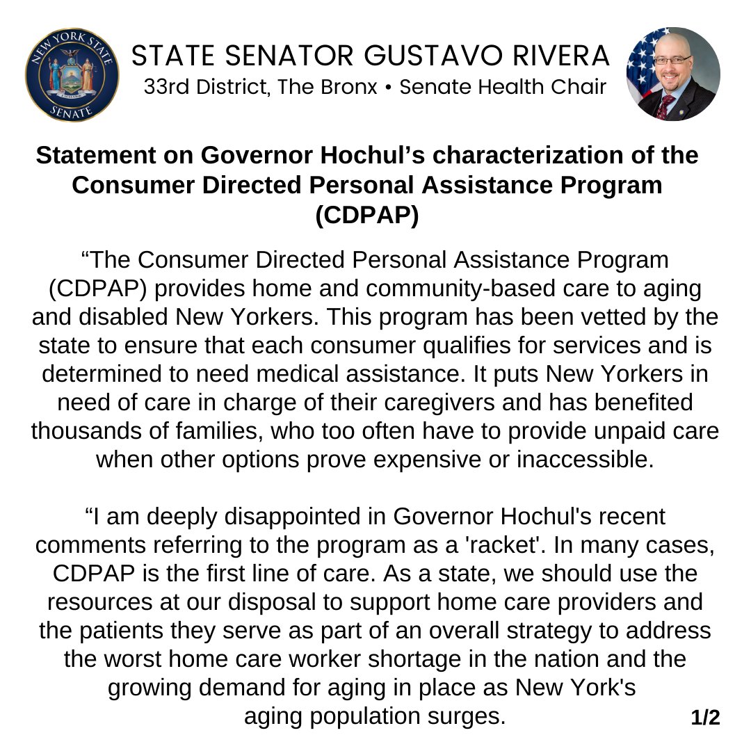 Senator Rivera released the following statement regarding Governor Hochul’s characterization of the Consumer Directed Personal Assistance Program (CDPAP).