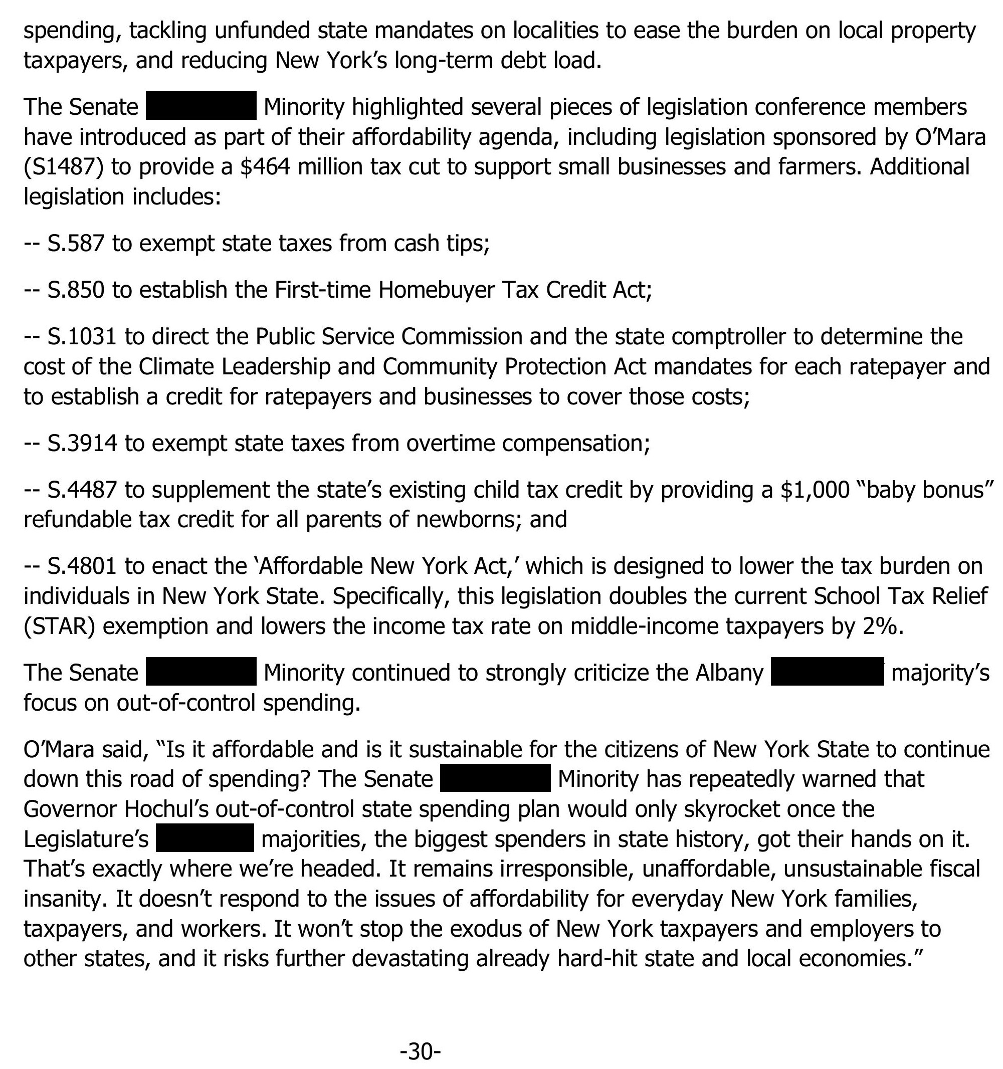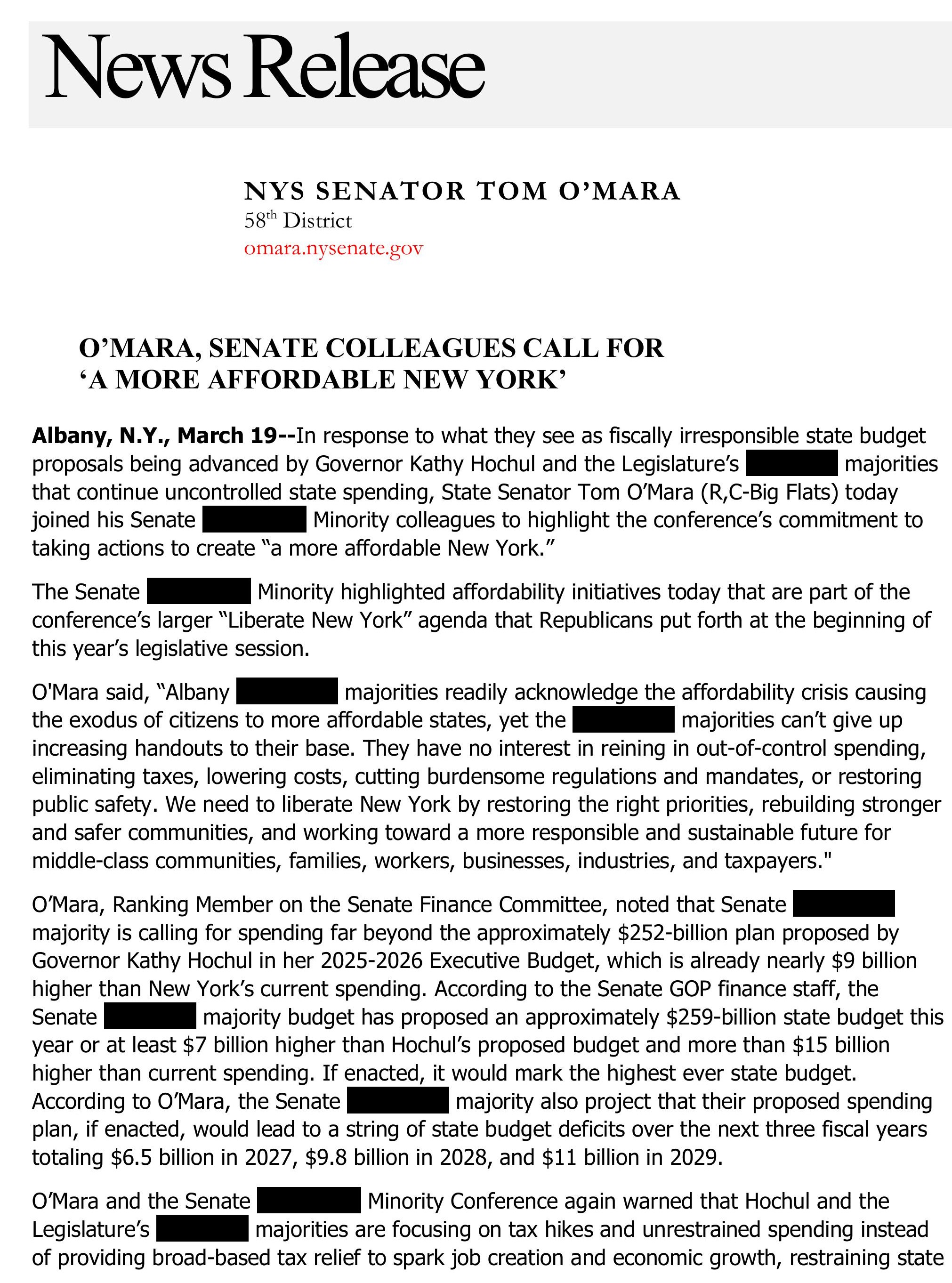 "They have no interest in reining in out-of-control spending, eliminating taxes, lowering costs, cutting burdensome regulations and mandates, or restoring public safety. We need to liberate New York by restoring the right priorities," said Senator O'Mara.