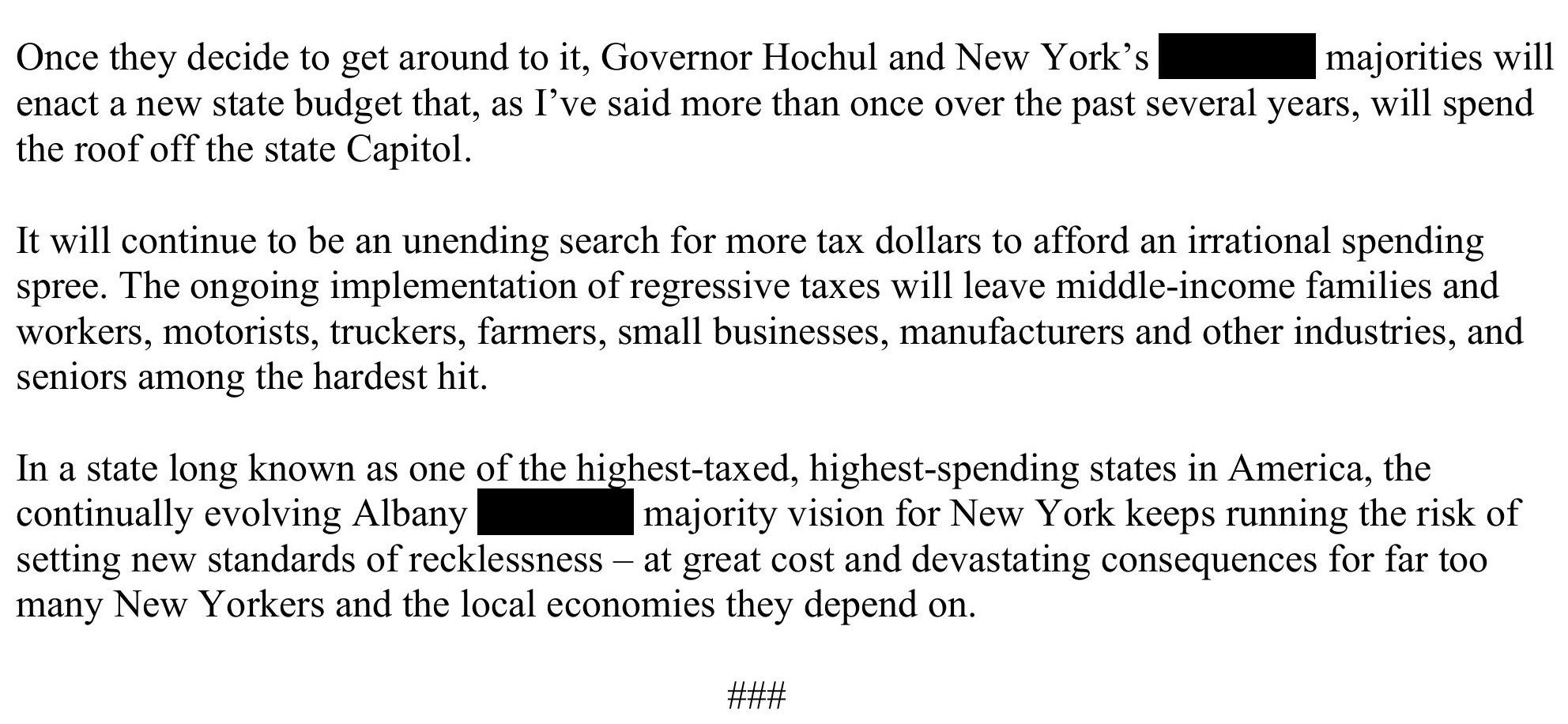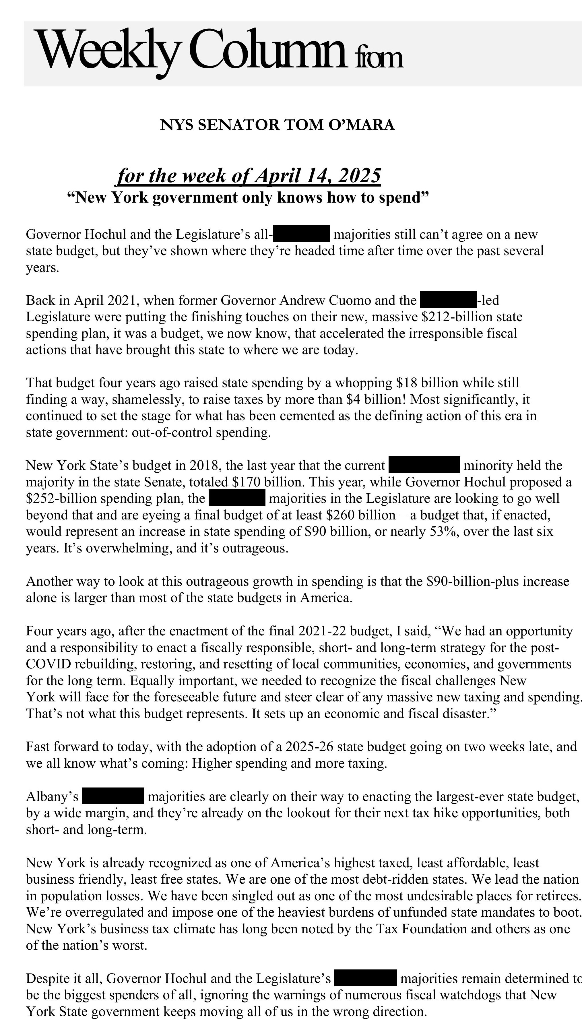 Senator O'Mara's weekly column 'From the Capitol' -- for the week of April 14, 2025 -- 'New York government only knows how to spend'