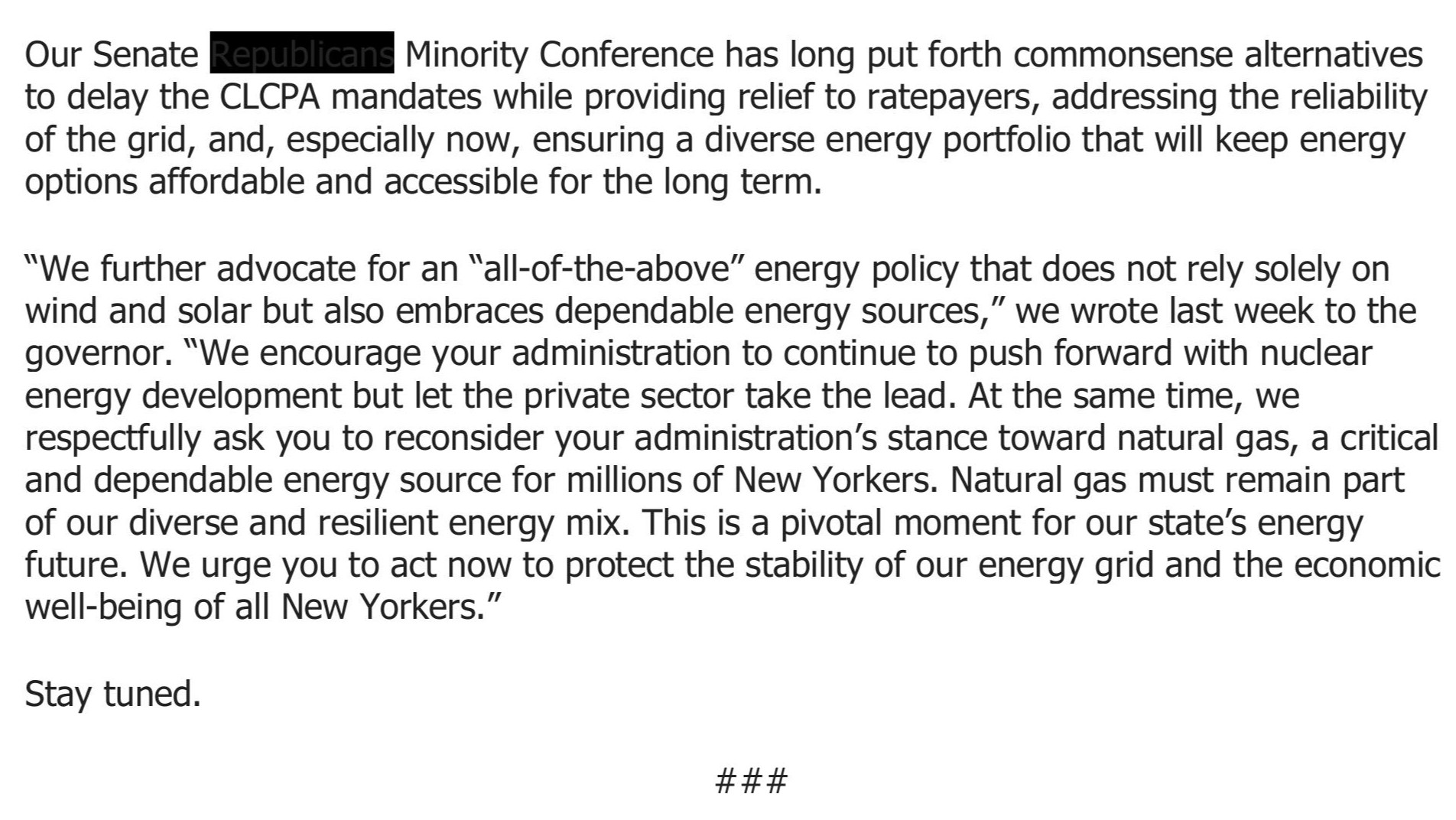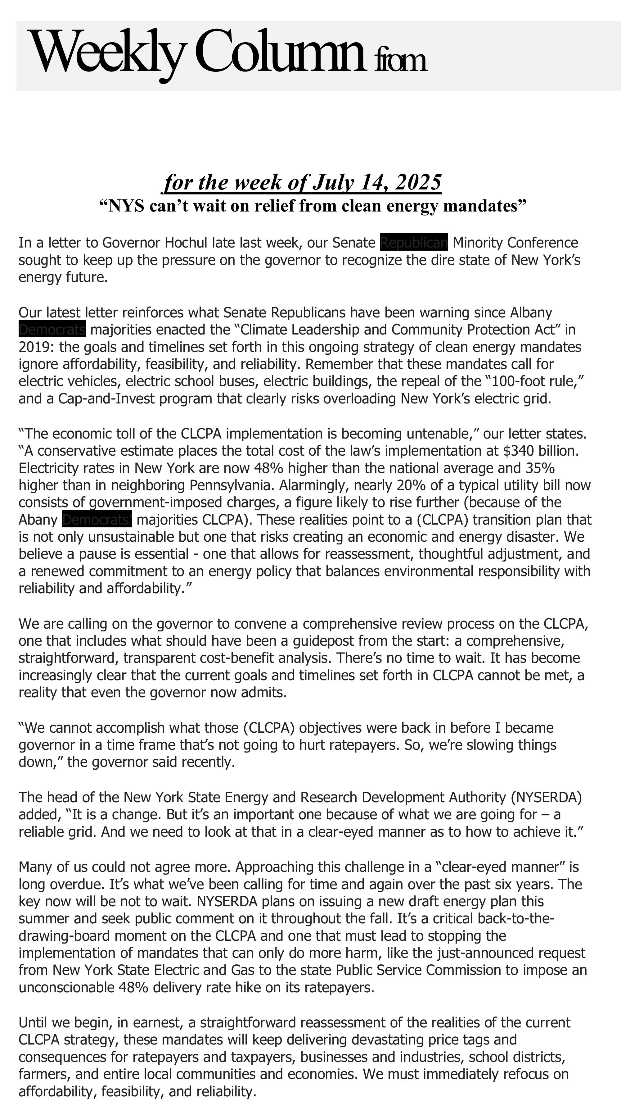 Senator O'Mara's weekly column 'From the Capitol' -- for the week of July 14, 2025 -- 'NYS can't wait on relief from clean energy mandates'