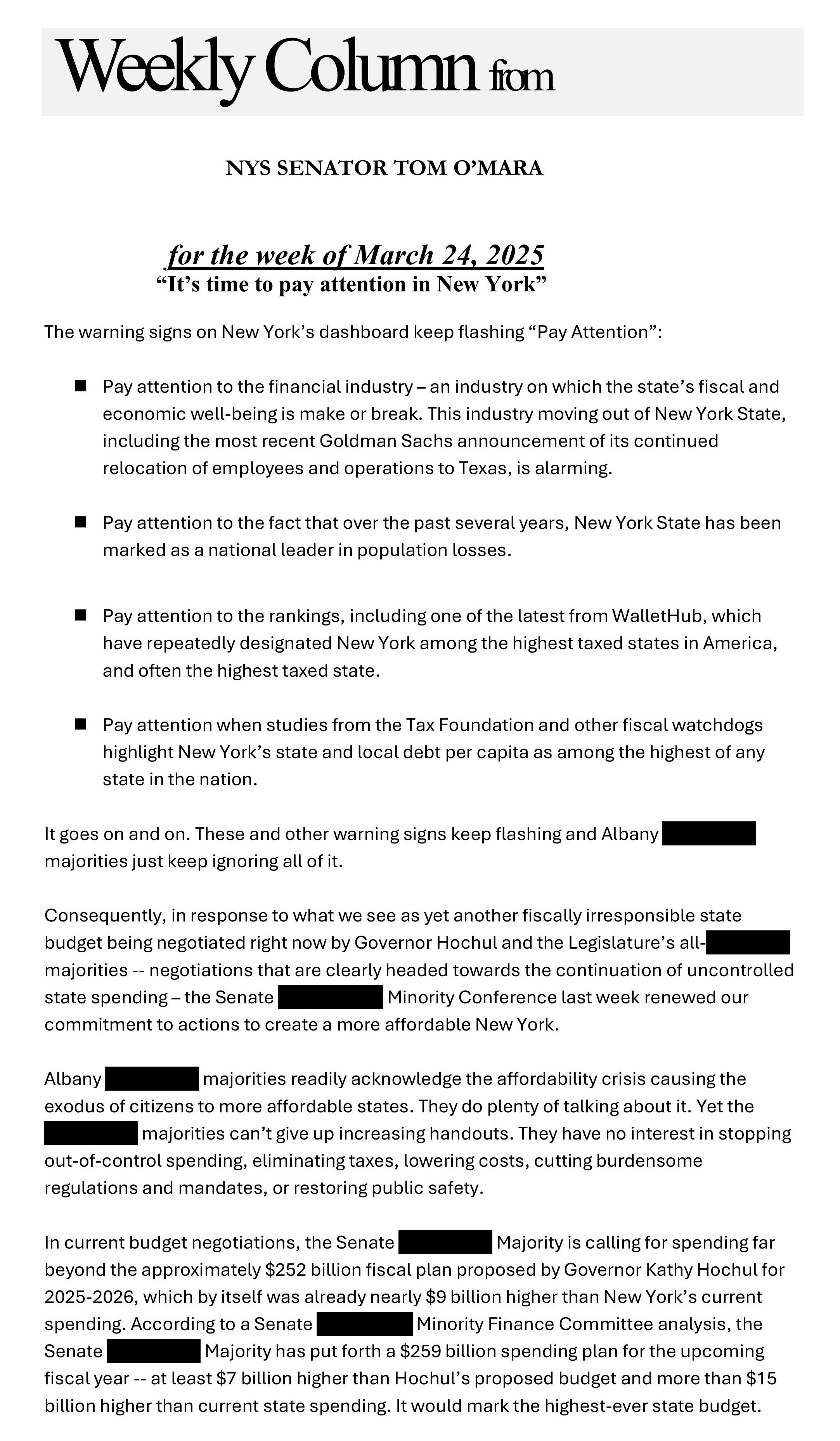 Senator O'Mara's weekly column 'From the Capitol' -- for the week of March 24, 2025 -- 'It's time to pay attention in New York'