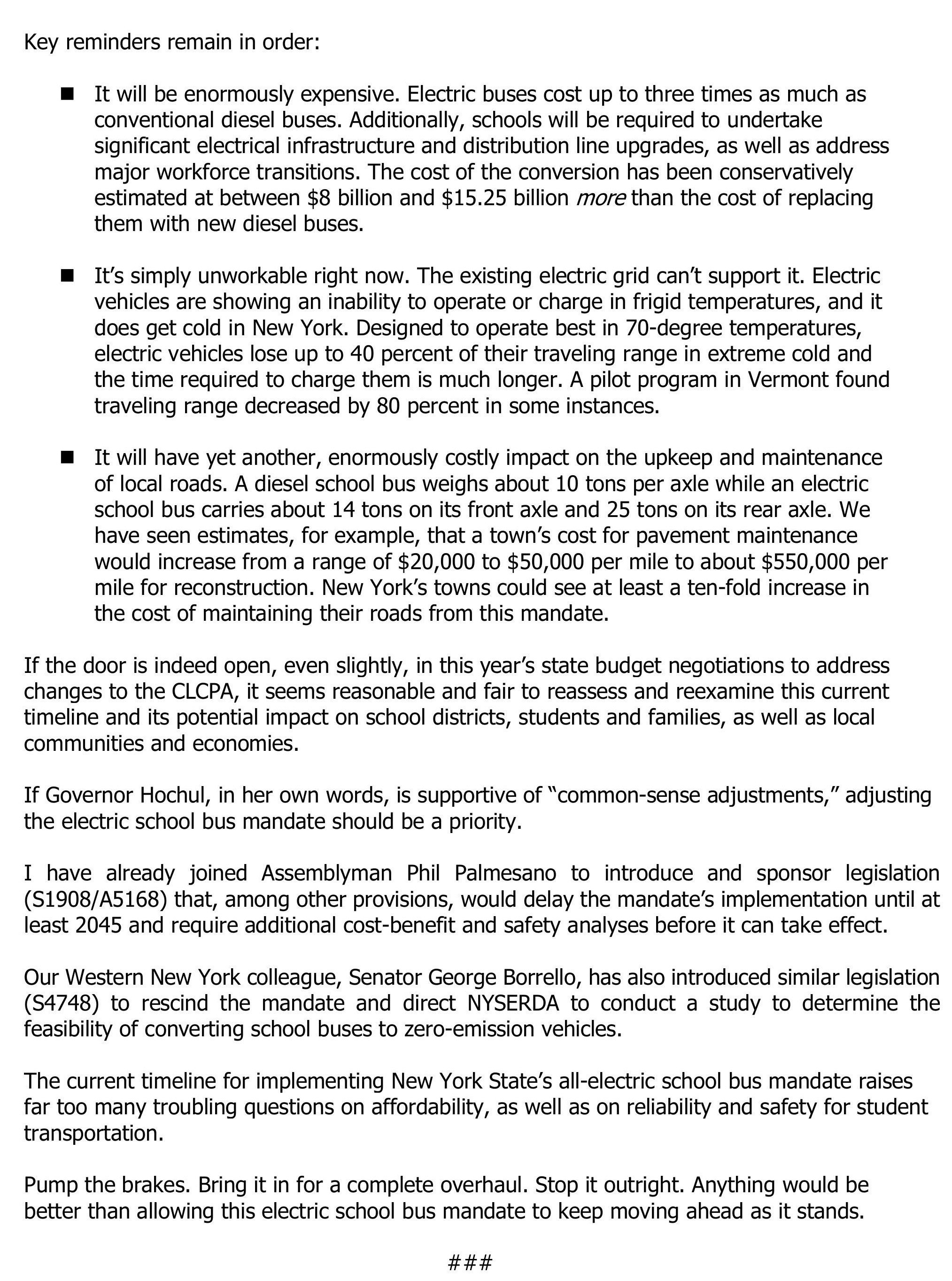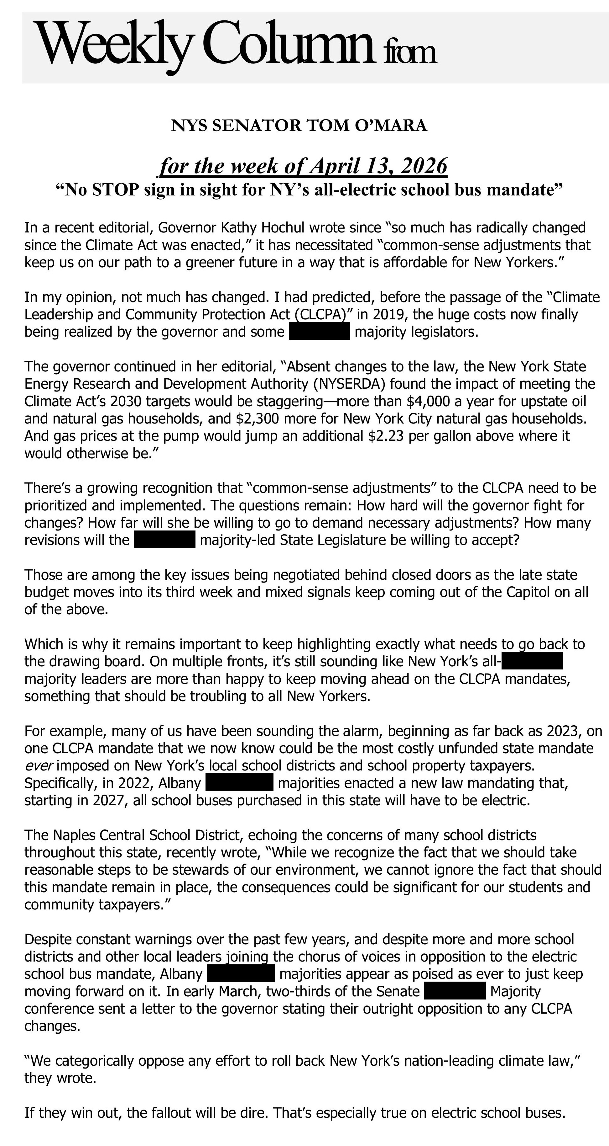 Senator O'Mara's weekly column 'From the Capitol' -- for the week of April 13, 2026 -- 'Still no STOP sign in sight for NY's all-electric school bus mandate'
